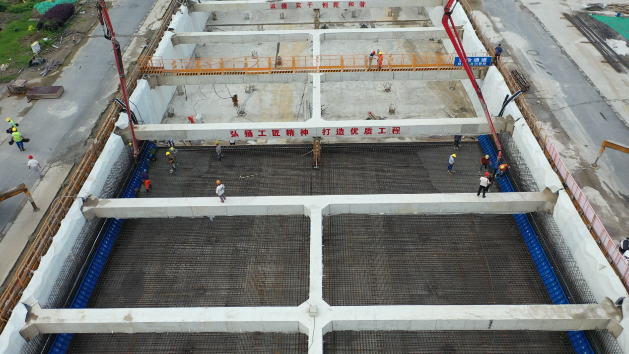 運(yùn)河南北路快速化改造一期工程(施井路-二里橋路南)項(xiàng)目擬建文昌路隧道及運(yùn)河路隧道,兩條隧道全長(zhǎng)1031米。其中,文昌路隧道貫穿市區(qū)文昌路,瀕臨古運(yùn)河,如何做好降水防水是基坑開挖后項(xiàng)目部所面臨的最大難點(diǎn)。洽逢汛期,為了確保底板順利澆筑,項(xiàng)目部一方面加大人材機(jī)的投入,設(shè)置多處降水井控制基坑地下水位,確保排水通暢;另一方面,嚴(yán)把材料質(zhì)量關(guān),將滲漏隱患止于萌芽、將安全防線筑于手中。同時(shí),在澆筑過程中,項(xiàng)目負(fù)責(zé)人和技術(shù)、安全、試驗(yàn)等相關(guān)人員全程對(duì)混凝土灌注進(jìn)行監(jiān)控把關(guān)。
