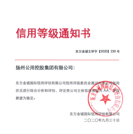 9月30日,經東方金誠國際信用評估有限公司評級委員會最終審定,給予揚州公用控股集團有限公司AA主體信用評級,評級展望為穩(wěn)定。