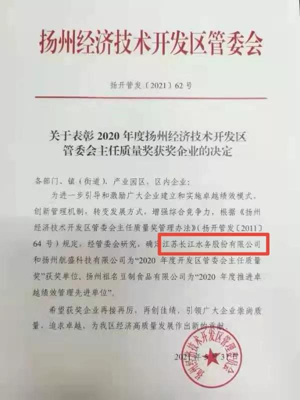 6月4日,揚州市經濟技術開發(fā)區(qū)召開全區(qū)質量大會,表彰在質量管理方面取得突出成效的企業(yè)組織,長江水務公司榮獲“2020年度開發(fā)區(qū)管委會主任質量獎”。