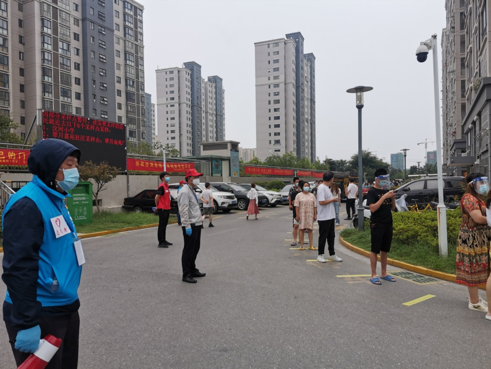 “請大家排好隊,保持一米以上安全距離,不要造成人員聚集,請?zhí)崆皽?zhǔn)備好你的身份證……”志愿者不斷提醒居民注意。在翠月花園核酸采集點,志愿者們穿梭在排隊人群中,邊安撫居民緊張情緒,邊引導(dǎo)居民即測即走?!半m然天氣很悶熱,工作量很大,但是我們有信心能保質(zhì)保量完成全小區(qū)核酸檢測任務(wù)?!彼麄儾活櫤韲邓粏?,依舊熱情且耐心地回答居民的問題,引導(dǎo)現(xiàn)場秩序。11日下午,雨淅淅瀝瀝下個不停。雖然避雨棚近在咫尺,但志愿者們面對風(fēng)雨寸步不離崗位,他們笑著說道“這點風(fēng)雨算啥呀?”一周來,志愿者們協(xié)助社區(qū)開展了4次核酸檢測,共檢測居民約12000人次。