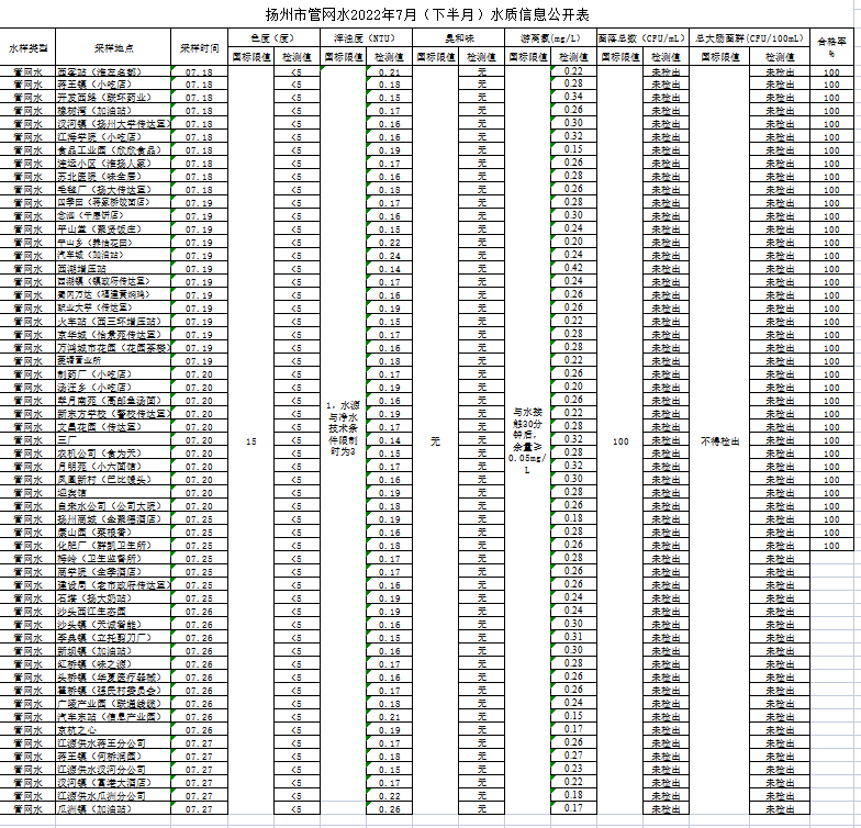 揚(yáng)州市管網(wǎng)水2022年7月(下半月)水質(zhì)信息公開表