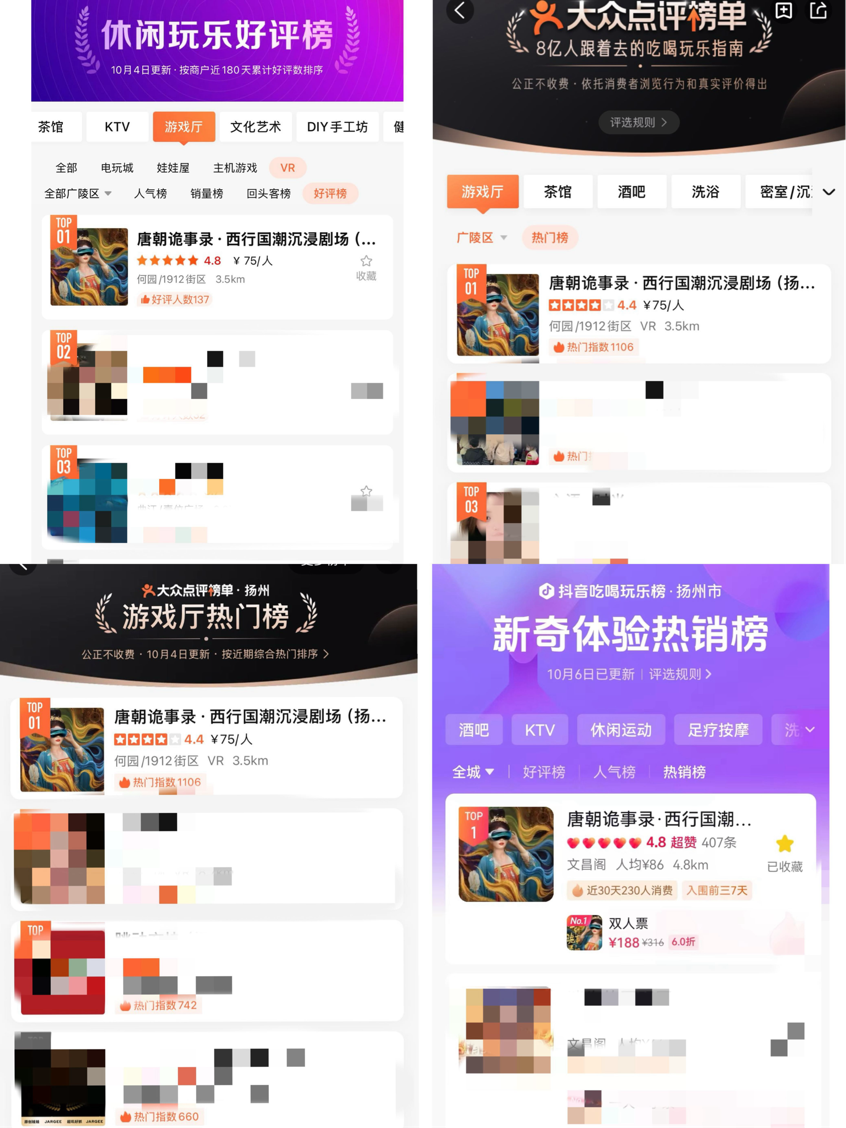 秋澄萬(wàn)景麗,舉國(guó)同歡慶。這個(gè)國(guó)慶假期,揚(yáng)州城控集團(tuán)《唐朝詭事錄·西行》國(guó)潮沉浸式劇場(chǎng)迎來(lái)了開(kāi)業(yè)后的首個(gè)旅游熱潮,大眾點(diǎn)評(píng)、美團(tuán)多榜封頂,穩(wěn)居Top1,好評(píng)如潮;抖音、小紅書(shū)、美團(tuán)、點(diǎn)評(píng)等推廣平臺(tái)相關(guān)話(huà)題、短視頻等曝光量超500w,揚(yáng)州文旅、揚(yáng)州發(fā)布等官方媒體相繼對(duì)唐詭的熱潮進(jìn)行了宣傳報(bào)道,成為國(guó)慶黃金周揚(yáng)州文旅市場(chǎng)一大亮點(diǎn)。