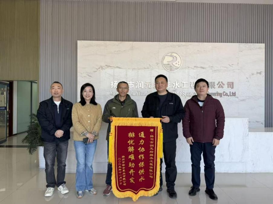 11月19日,揚(yáng)州市物合置業(yè)有限公司將一面繡有“通力協(xié)作保供水,排憂解難助開(kāi)發(fā)”的錦旗送到長(zhǎng)江水務(wù)潤(rùn)元公司工作人員手中,對(duì)潤(rùn)元公司高效、優(yōu)質(zhì)、便捷、暖心的服務(wù)表示衷心感謝和認(rèn)可。